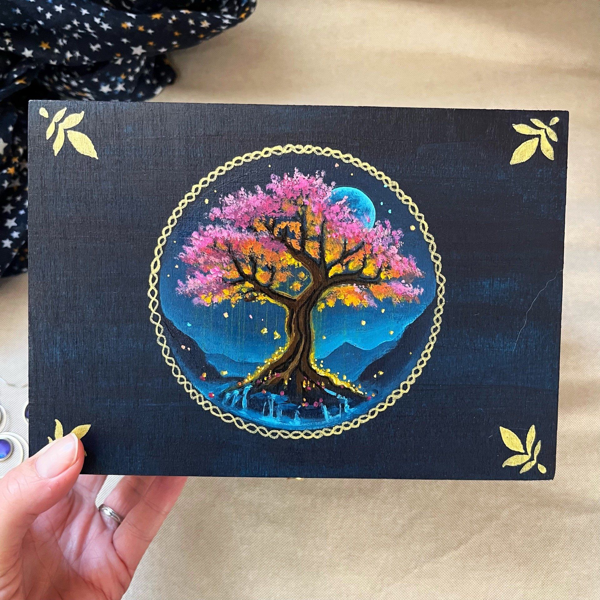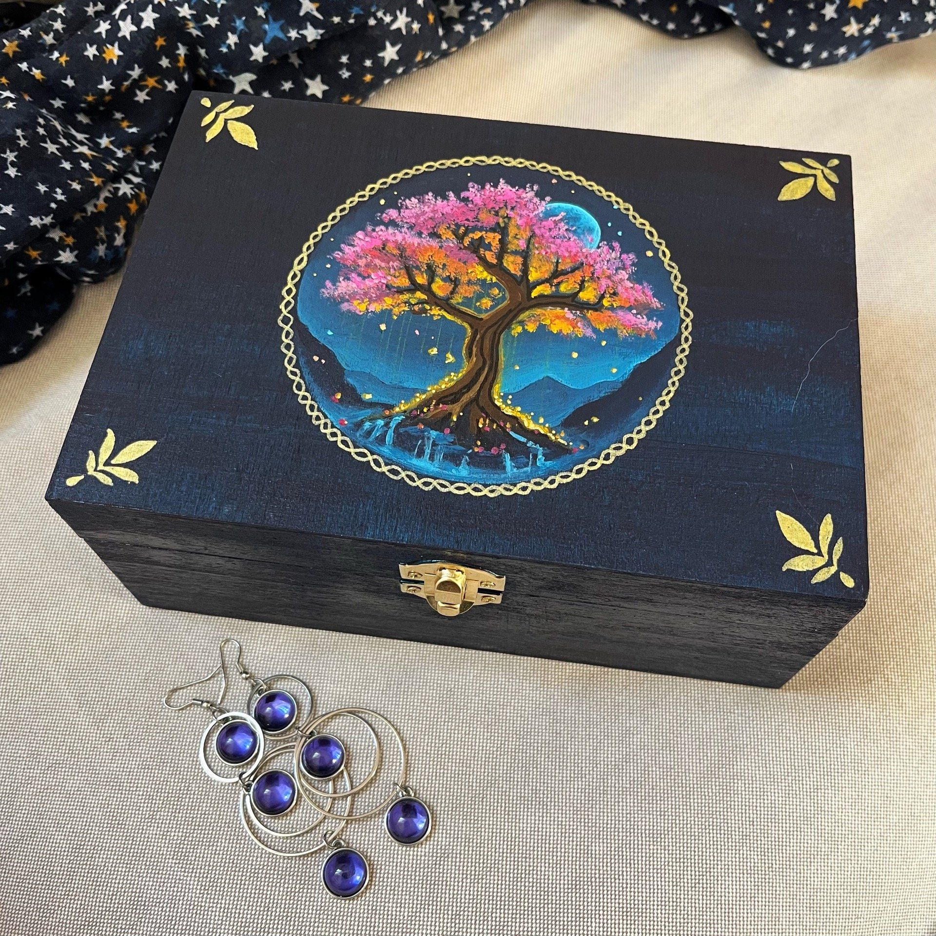 Une boîte à bijoux unique, ornée d’un arbre japonais au feuillage rose sur un fond bleu outremer. Des couleurs très classiques réhaussées d'or.