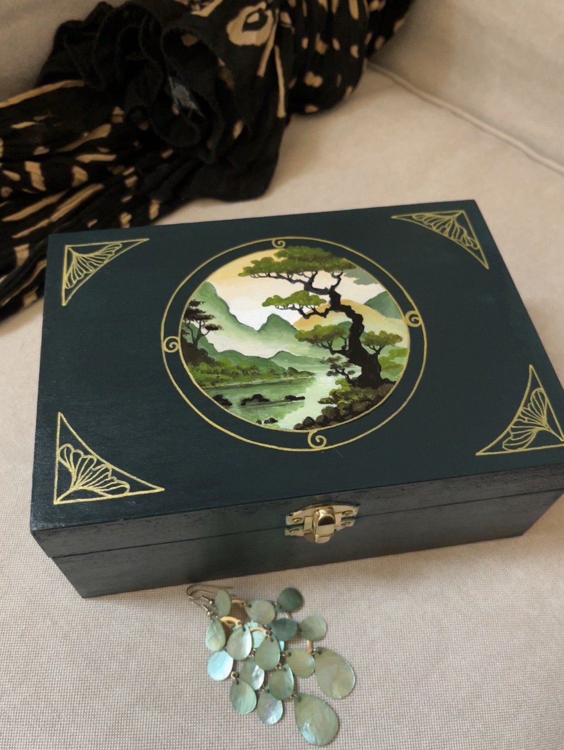 Une boîte à bijoux unique vert émeraude, ornée d'un paysage japonais. Un très beau camaïeu de verts, de jaune et d'or
