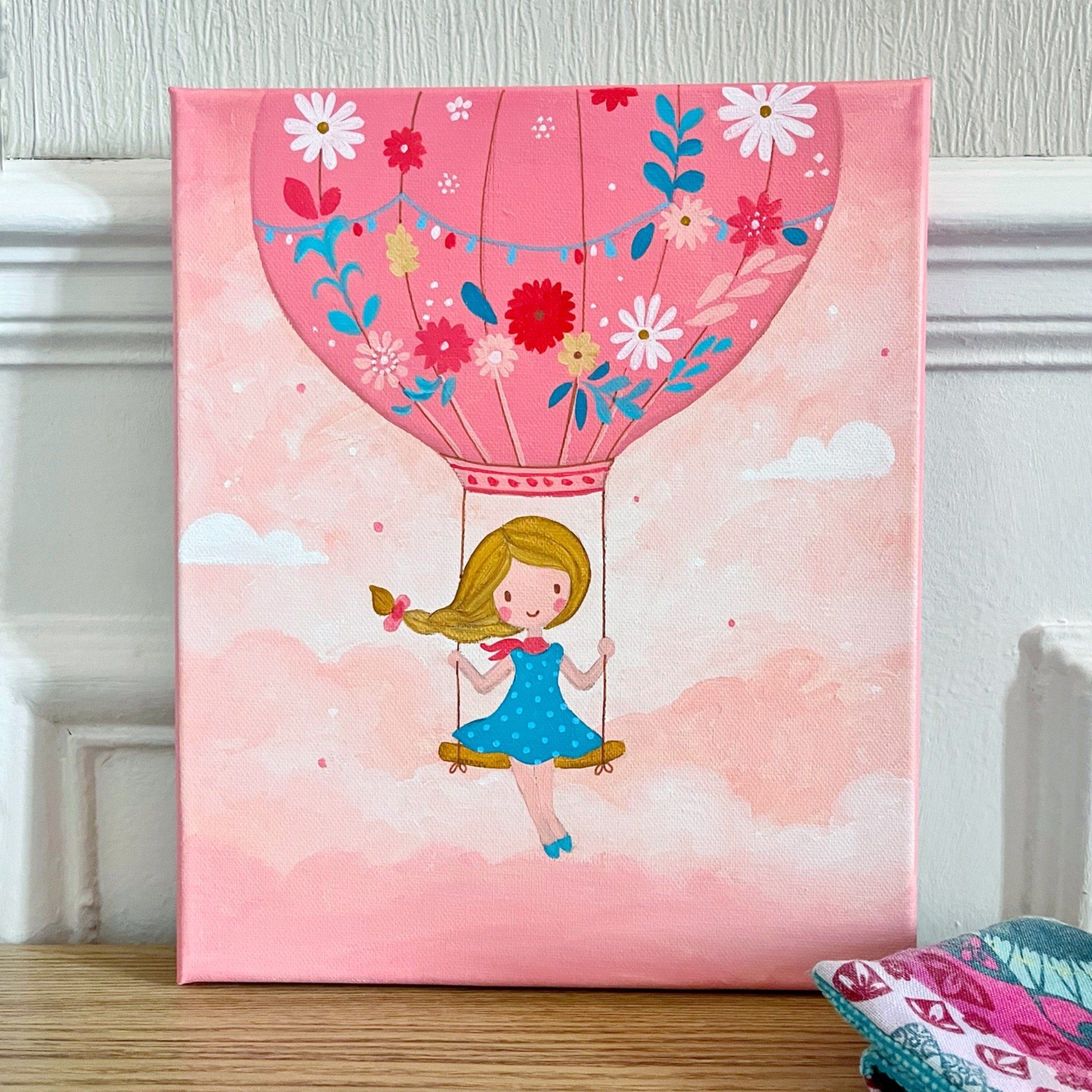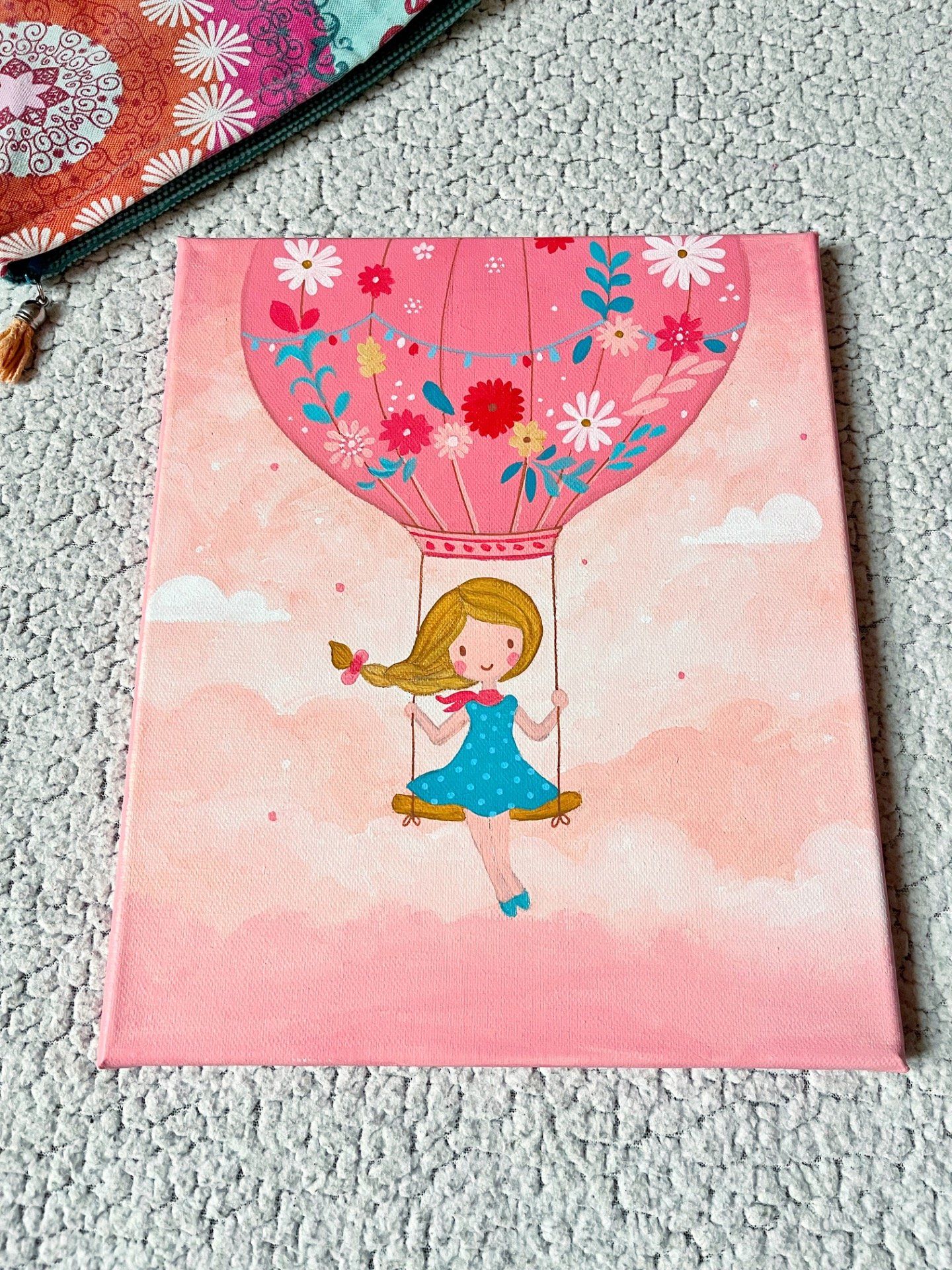 Un tableau très poétique, dans un camaïeu de nuages roses. Une petite fille s'envole dans ses rêves. Une balançoire suspendue à une montgolfière.